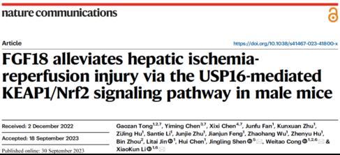 Prof. Jingling SHEN from College of Life and Environmental Science Publishes Academic Paper in Nature Communications Recently, Professor Jingling SHEN from the College of Life and Environmental Science, in collaboration with Academician Xiaokun LI from Wenzhou Medical University, published a research paper online in Nature Communications titled "FGF18 alleviates hepatic ischemia-reperfusion injury via the USP16-mediated KEAP1/Nrf2 signaling pathway in male mice". The study discovered that FGF18 reduces oxidat...