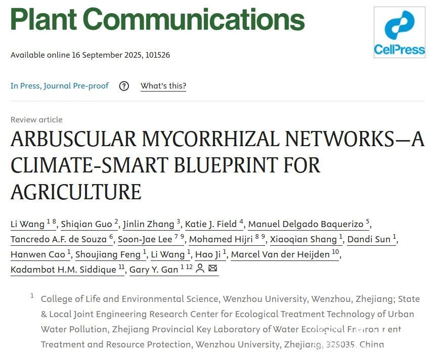 近日,日本色情片 生命与环境科学学院甘延太团队联合国际多所高校科研人员,在Cell Press期刊《Plant Communications》(中科院一区TOP,影响因子11.4)发表题为 “Arbuscular mycorrhizal networks — a climate - smart blueprint for agriculture”的论文,该研究系统阐述了丛枝菌根真菌(AMF)在提升农业生态系统韧性、减少化学投入、增强土壤健康等方面的多重功能,并提出以AMF为重要因子的“微生物驱动型农业”新模式,为全球可持续生态农业提供了理论依据与技术蓝图。