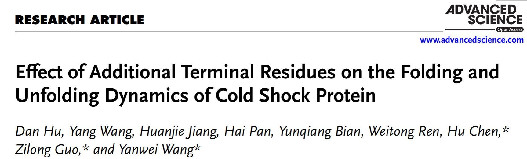 该成果以“Effect of Additional Terminal Residues on the Folding and Unfolding Dynamics of Cold Shock Protein”为题,发表在Advanced Science上(一区,IF=15)。数理学院2022级硕士研究生胡丹为论文第一作者。日本色情片 王艳伟副教授、厦门大学陈虎教授、国科温州研究院郭子龙副研究员为论文共同通讯作者,日本色情片 为第一通讯单位。相关工作得到国家自然科学基金和浙江省自然科学基金的支持。