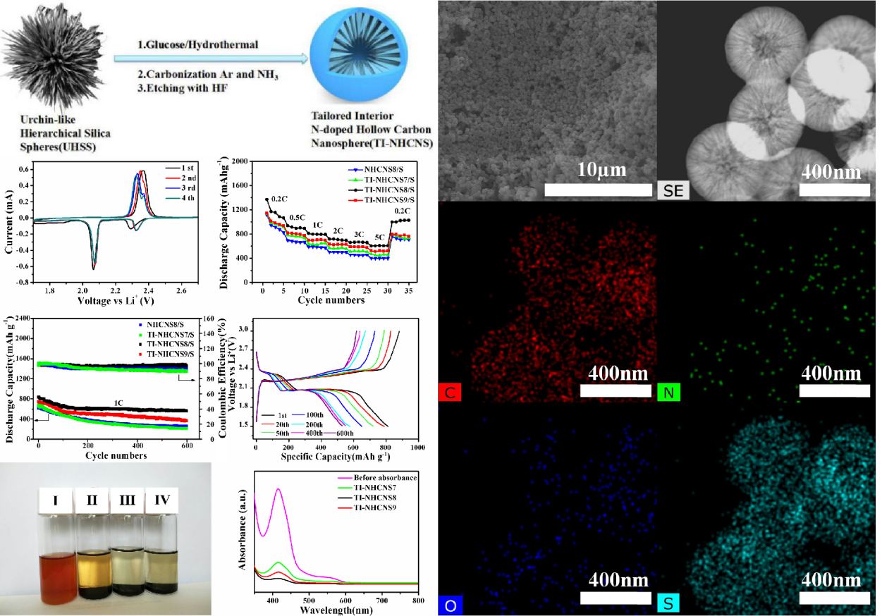 最近,我院2017级硕士研究生余志升等受课题组前期在分级多孔碳纳米片、花型碳纳米球设计合成及在锂硫电池应用基础研究工作(Adv. Energy Mater.2014, 4, 1301988、J. Mater. Chem. A, 2017, 5, 6245)的启发,创新提出一种中空碳球内部结构调控策略,设计合成了具有径向向内对齐的倒刺结构中空氮掺杂碳小球,作为硫主体表现出高的容量和出色的循环稳定性。通过碳球内部硫分布表征、锂离子扩散系数测定、多硫离子吸附试验、循环前后硫正极结构变化、循环后锂负极枝晶形成剖析,揭示其固硫机制,阐明性能提升原因为碳球内部碳刺可有效分散绝缘硫和硫化锂、刺刺之间空隙和空心结构有效缓冲硫体积变化造成应变、氮原子掺杂碳层高效抑制多硫离子流失。此外,该新型结构的碳球有望拓展到其它储能体系如钠磷、钾磷、硅基电池中应用。相关结果于近期发表在Angew. Chem. Int. Ed. 2020, 59, 6406. (//onlinelibrary.wiley.com/doi/10.1002/ange.201914972) 上。