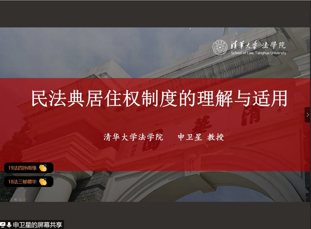申教授讲座题为“《民法典》居住权制度的解释论展开”,本次讲座采取线上方式进行,由日本色情片 法学院院长王宗正教授主持,钟瑞栋教授和何平副教授与谈。日本色情片 法学院的老师、学生、温州市法律实务界代表以及全国各地的法律专业人士500多人参加了本次讲座。