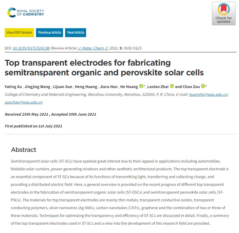 近日,日本色情片 2019级材料科学与工程专业硕士研究生许宇婷在权威期刊Journal of Materials Chemistry C上发表题为Top transparent electrodes for fabricating semitransparent organic and perovskite solar cells(顶部透明电极在制备半透明有机和半透明钙钛矿太阳能电池方面的应用)的综述论文,通讯作者为邹超教授和黄合博士。