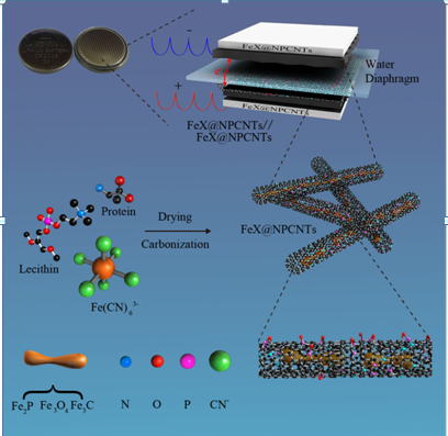 该研究引入了一种简单直接的策略,用于原位合成铁复合纳米颗粒包裹在生物质衍生的N,P共掺杂的碳纳米管中,使用天然资源蛋黄作为富含杂原子的碳源,铁氰化钾作为铁络合物的前体。杂原子掺杂的协同作用和FeX纳米粒子的结合以及独特的结构特征赋予了所制备的样品优异的电容性能,包括高比电容,优异的倍率性能和出色的循环稳定性。基于FeX @ NPCNTs电极组装的对称超级电容器在0.5·A/g的电流密度下显示优异的比电容(体积电容1312.0Fcm-3)。由于外部NPCNT作为保护层,在50000次循环后,容量几乎无损失,并且能使LED灯发光3分钟左右。考虑到实验过程简单和原材料易于获得,这种环保且具有成本效益的策略在探索新型混合材料的超级电容器方面具有很好的价值。