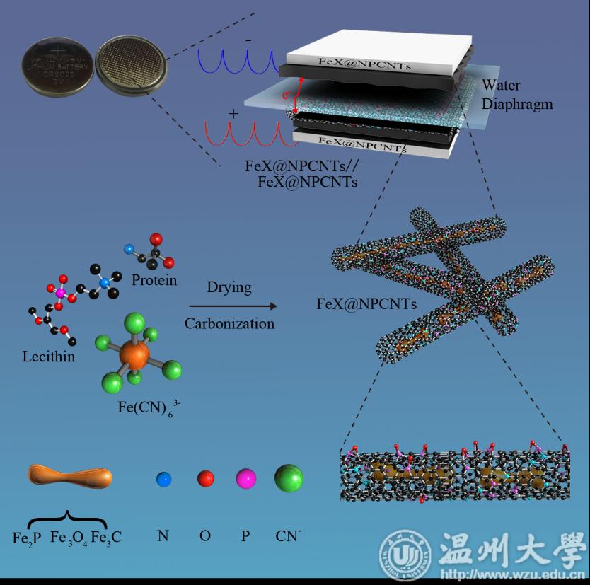 该研究引入了一种简单直接的策略,用于原位合成铁复合纳米颗粒包裹在生物质衍生的N,P共掺杂的碳纳米管中,使用天然资源蛋黄作为富含杂原子的碳源,铁氰化钾作为铁络合物的前体。杂原子掺杂的协同作用和FeX纳米粒子的结合以及独特的结构特征赋予了所制备的样品优异的电容性能,包括高比电容,优异的倍率性能和出色的循环稳定性。基于FeX @ NPCNTs电极组装的对称超级电容器在0.5·A/g的电流密度下显示优异的比电容(体积电容1312.0Fcm-3)。由于外部NPCNT作为保护层,在50000次循环后,容量几乎无损失,并且能使LED灯发光3分钟左右。考虑到实验过程简单和原材料易于获得,这种环保且具有成本效益的策略在探索新型混合材料的超级电容器方面具有很好的价值。
