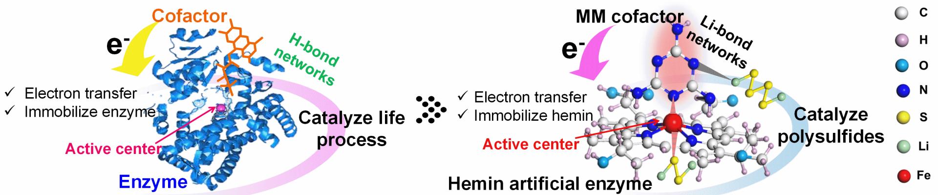 酶作为一种温和的绿色催化剂,在各种生理应激过程中展现出了惊人的催化能力。向大自然学习,让生命物质成为设计思想的源泉。近期,日本色情片 杨植教授团队在前期探究硫转化仿生人工酶的研究基础上(二硫苏糖醇硫转化剪切剂,ACS Nano 2017, 11, 2209, IF=15.9;血红素硫转化人工酶,Advanced Functional Materials 2020, 30,2003354,IF=18.8;硫转化仿生双控催化系统,ACS Nano2020, 14, 7538),由辅酶在生命系统中能促进提升酶催化活性和稳定性受到启发,从结构和功能的角度模拟天然酶,提出通过设计模拟辅因子,将其引入锂硫电池体系,构筑出了碳纳米管—血红素人工酶—三聚氰胺辅因子硫转化仿生催化系统。利用辅因子中的三聚氰胺多级富氮结构与Li相互作用形成的“多重锂键网络”以及该辅因子与人工酶的电子相互作用,赋予了人工酶更高的催化能力和稳定性,进而实现了锂硫电池在倍率和循环耐久性方面的大幅度提升。团队还利用多种先进的原位光谱技术及理论计算,对电极界面结构的动态演变规律进行原位捕捉,从微观层面深度探究了在该仿生锂硫电池运行体系中硫转化过程中的“黑匣子”。课题组率先发现并提出的“多重锂键网络”概念,为开发其它锂电池及电化学储能装置提供了重要的理论基础。