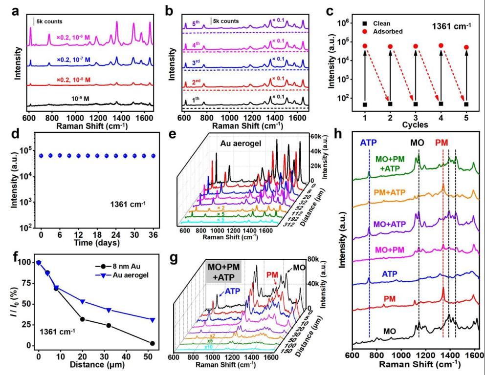 以日本色情片 胡悦副教授、北京理工大学杜然教授、德累斯顿工业大学Alexander Eychmüller教授为首的国际团队在前期工作中,通过对金属气凝胶合成方法学的深入探索,开发了一系列可控制备方法,实现了金属凝胶的快速制备及其特征尺寸、比表面积、孔容等多种参数的大范围调控(Sci. Adv.2019, Nat. Commun.2020, Matter2020)。在此基础上,上述团队再次携手,以网络特征尺寸为5-100 nm的金气凝胶为例,从理论与实验两个角度系统探究了气凝胶基底的特征尺寸与SERS活性依赖性。通过对相关参数的优化,不仅获得了大对焦容差的SERS基底(>300 μm),更实现了对染料分子、农药和致癌物质的高灵敏度与多通道检测。