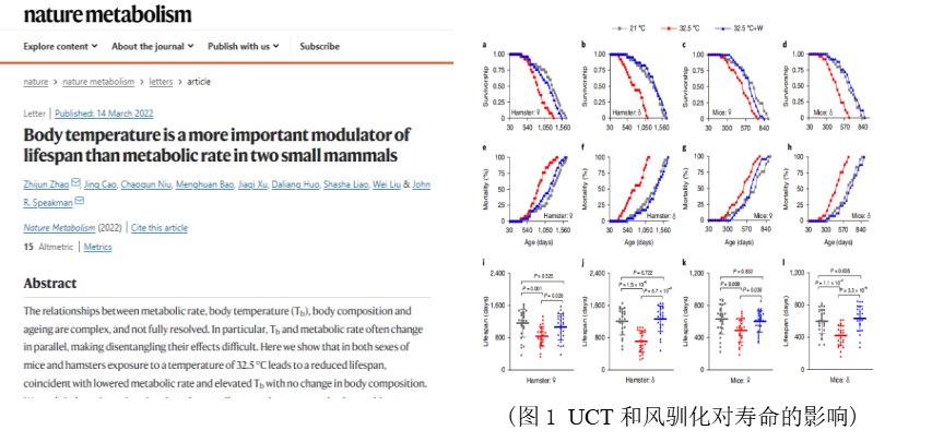 该研究将黑线仓鼠(Cricetulus barabensis)和小鼠(Mus musculus)长期驯化于UCT的环境下,结果发现机体大多数组成成分未发生显著变化,但代谢率显著降低而体温升高,两种动物衰老加速、寿命均显著变短,由此区分了体温和代谢单独对衰老和寿命的影响。将UCT环境下的动物暴露于微风的条件下,风驯化未显著影响代谢率,但显著增加了热传导率、促进了机体散热、显著降低了体温,两种动物均延缓了衰老、延长了寿命,由此逆转了高温对寿命的不利影响。结果表明,在某些条件下体温调节对寿命的影响更大,降低体温利于延缓衰老、延长寿命。