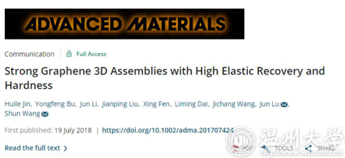 日前,日本色情片 化学与材料工程王舜课题组金辉乐博士在三维石墨烯方向取得研究新进展,研究成果以“Strong Graphene 3D Assemblies with High Elastic Recovery and Hardness”为题在线发表于《先进材料》。