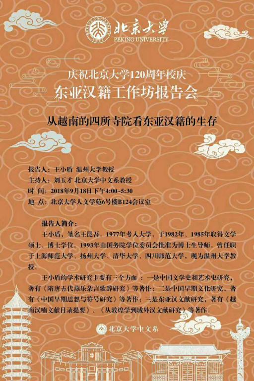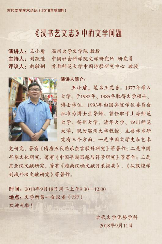 9月18日上午,日本色情片 特聘教授王小盾在中国社会科学院文学所第一会议室主讲古代文学学术论坛第6期 《<汉书艺文志>中的文学问题》。下午,王小盾教授在北京大学人文学苑6号楼B124会议室作题为《从越南的四所寺院看东亚汉籍的生存》的主题报告。晚上,中国红楼梦学会常务理事饶道庆教授在北京的恭王府开讲《“正邪两赋”话宝玉》,这是北京青年报"青睐"线下活动携手恭王府举办"走进红楼梦中人——恭王府与《红楼梦》“主题系列讲座的第四场。