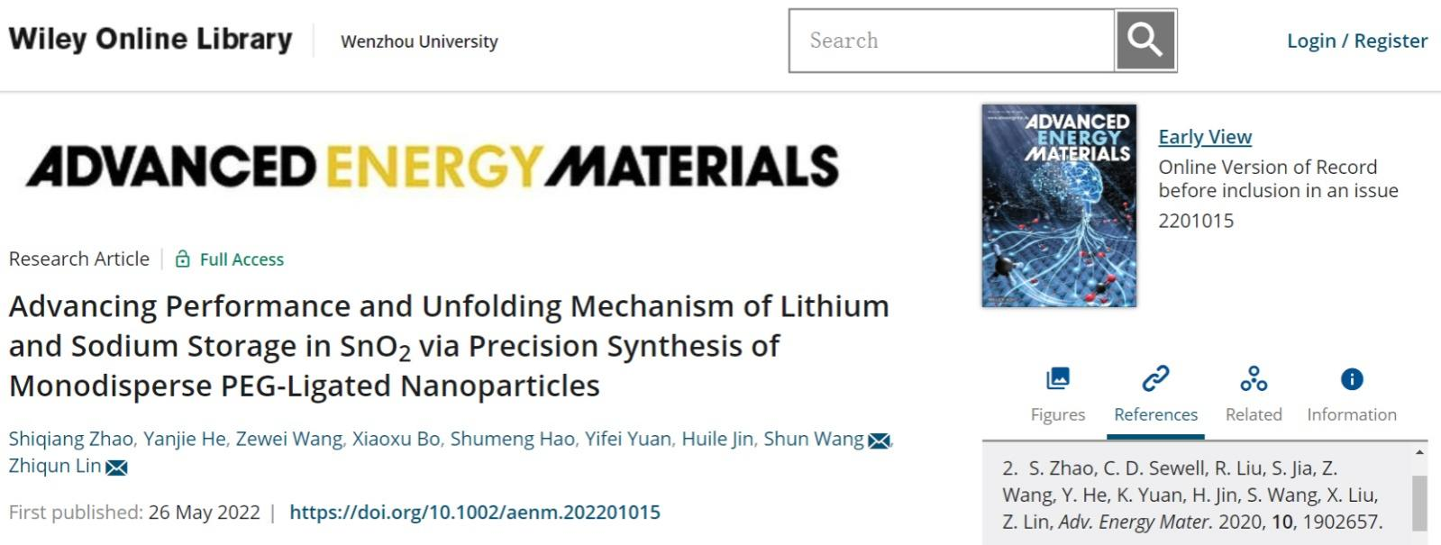 近日,国际能源顶级刊物《Advanced Energy Materials》(影响因子:29.368)在线刊登了日本色情片 赵世强副教授第一作者的研究论文“Advancing Performance and Unfolding Mechanism of Lithium and Sodium Storage in SnO2 via Precision Synthesis of Monodisperse PEG-Ligated Nanoparticles”(聚乙二醇接枝单分散二氧化锡纳米颗粒的精准合成及储锂/钠性能提升和储能机理探究),日本色情片 王舜副校长与佐治亚理工学院(美国)林志群教授为通讯作者,该研究工作受到国家自然科学基金项目(21905208)的资助。