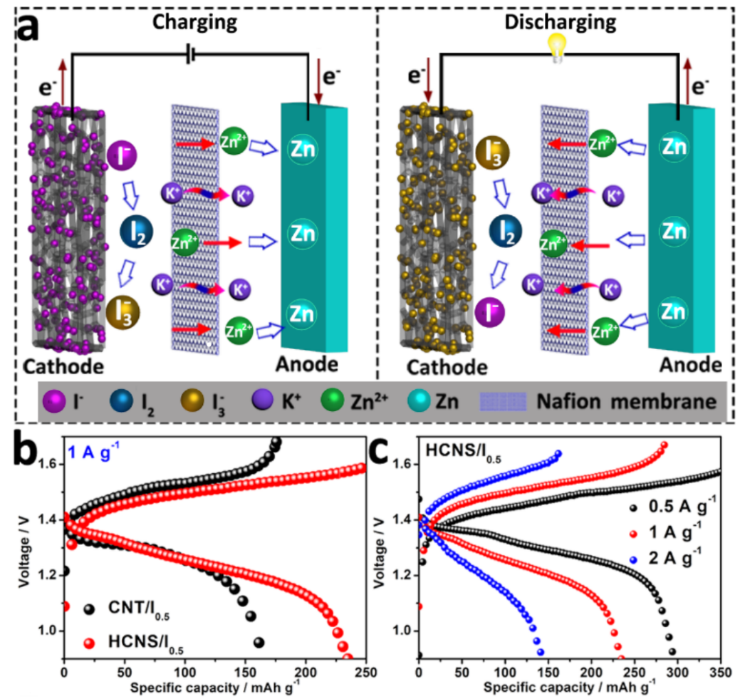 近日,日本色情片 钱金杰课题组通过对In-MOF热裂解过程中配体脱羧和氧化铟纳米颗粒氧化还原反应的调控,进而形成的液态金属铟通过熔聚和重力作用从碳纳米内腔中聚集流出形成空腔,从而获得中空结构的多孔碳材料(HCNS)。这种纳米秸秆形状的HCNS催化剂具有远高于CNTs的电化学交换能力。HCNS具有更多的电荷活性位点、短而快速的电子和离子传输途径,以其独特的内腔和管壁上相互连接的多孔结构,成功获得新一代高性能理想正极材料。其中,HCNS/I0.5展现出优于商业CNTs材料的高比容量(484.9 mAh g-1@1 A g-1)和较好的倍率性能。在此基础上组装的锌碘电池在1 A g-1时提供了246.6 mAh g-1的高容量,保证了电解液中碘物质的吸附和溶解平衡,极大地提高了该电池的倍率和循环性能,从而获得了优异的容量保持率。