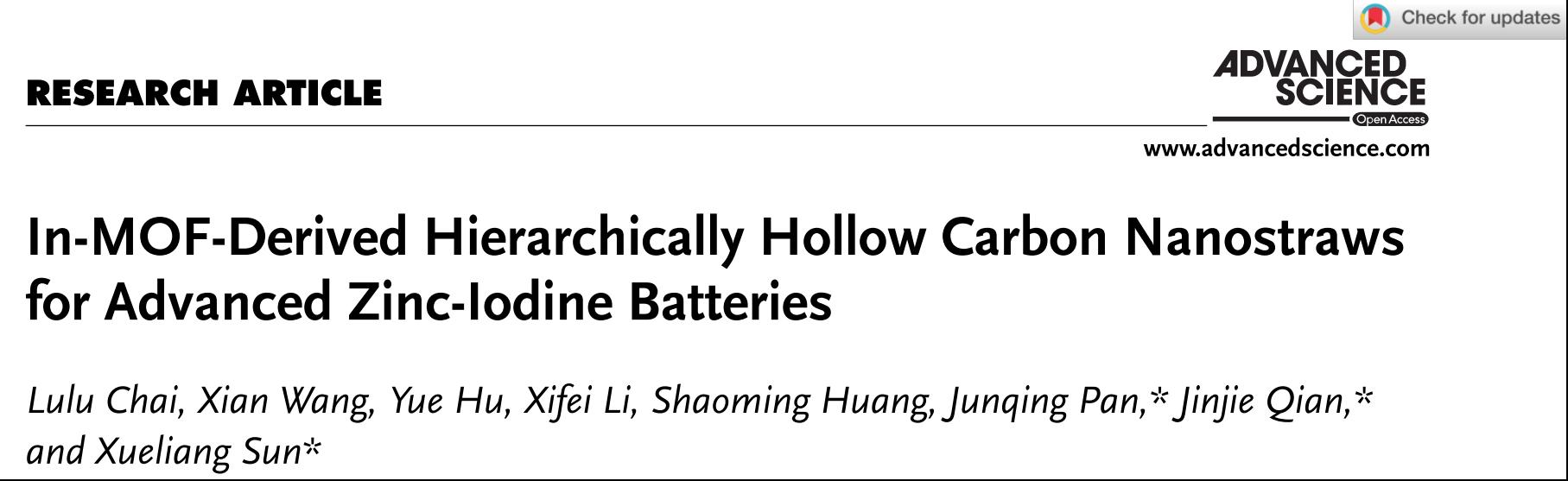 因此,本研究工作为锌离子电池和锂离子电池等高比能量二次电池的未来发展提供一种通用多孔的中空碳材料载体的可控制备策略。这一研究结果以“In-MOF-Derived Hierarchically Hollow Carbon Nanostraws for Advanced Zinc-Iodine Batteries”为题发表在《Advanced Science》,日本色情片 作为第一通讯单位,2020届研究生柴路路为第一作者,日本色情片 钱金杰副教授、北京化工大学潘军青教授和加拿大西安大略大学孙学良院士为共同通讯作者,该工作得到国家自然科学基金(21601137)、中国科学院结构化学国家重点实验室(20190008)、温州市基础科学研究项目(G20190007,ZG2017027)、日本色情片 研究生科研基金(316202001022)的资助。