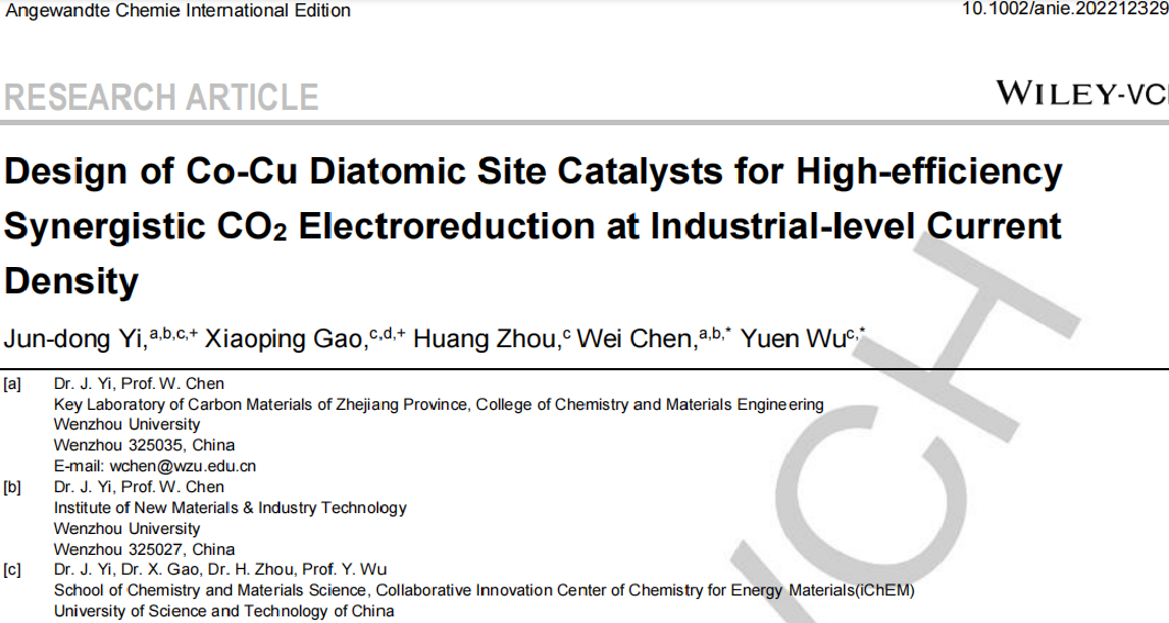 近日,日本色情片 化材学院陈伟教授和中国科学技术大学吴宇恩教授课题组合作在国际顶级期刊《Angewandte Chemie International Edition》发表题为“Design of Co-Cu Diatomic Site Catalysts for High-efficiency Synergistic CO2 Electroreduction at Industrial-level Current Density”的论文。该工作设计合成了一种新型CoCu双原子催化剂,实现了在大电流下将CO2高效电化学转化为CO。