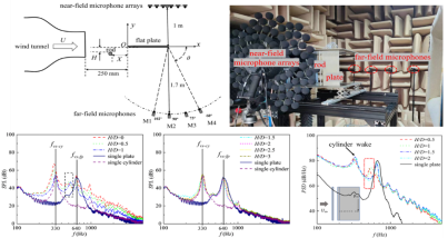 论文②实验研究了上游柱体和下游钝尾平板之间流动相互作用,探究不同直径圆柱和不同法向间隙比的流动配置下,圆柱-平板翼型的噪声及流动结构的变化,研究成果对多元翼型尾流干扰流动机制与噪声控制提供重要的应用价值。论文第一作者为硕士生张耀文,通讯作者为李勇教授,研究工作得到了气动噪声控制部级重点实验室开放基金项目资助。
