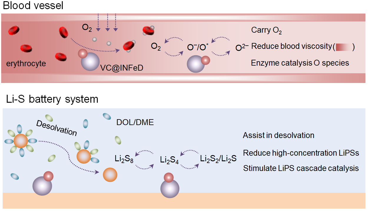 在此,受右旋糖酐铁(INFeD)和抗坏血酸(VC)联合作为治疗贫血的补血药启发,日本色情片 杨植教授、蔡冬博士与杨硕博士联合开发了一种高效的VC@INFeD硫正极催化剂,在多重H/Li键的协助下,溶剂化的多硫化锂(LiPSs)在正极/电解质界面上可通过具有梯度吸附能力的羟基基团完成富集和脱溶化,随后在INFeD链上完成转移,进而在VC@INFeD级联催化位点实现其彻底转化。结果表明,INFeD主要促进长链LiPSs的转化,VC加速短链LiPSs的转化,两者协同可以显著降低每个硫氧化还原步骤的能量势垒,并赋予锂硫电池优异的电化学性能。即使在高硫含量(5.2 mg cm‒1)和贫电解质(E/S,~7μL mg−1)条件下,也具有高硫利用率和良好的循环稳定性。