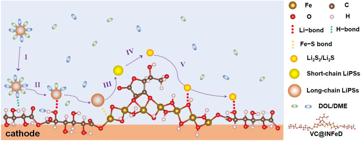 1. 在催化剂/电解质界面上合理设计氢键网络,与锂键协同作用,实现溶剂化LiPSs在催化剂表面的脱溶剂和富集,进一步激发后续催化过程。