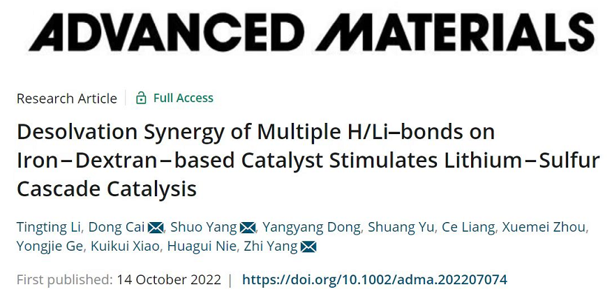 因此,本研究以“Desolvation Synergy of Multiple H/Li–bonds on Iron−Dextran−based Catalyst Stimulates Lithium−Sulfur Cascade Catalysis”为题发表在材料领域顶级期刊《Advanced Materials》。日本色情片 作为第一通讯单位,2020级研究生李婷婷为第一作者,日本色情片 化学与材料工程学院杨植教授、蔡冬博士和电气与电子工程学院杨硕博士为共同通讯作者,日本色情片 聂华贵教授、葛勇杰博士、肖逵逵博士、周学梅博士、硕士生梁策、于爽同学以及首届博士生东洋洋同学参与了这项工作。该工作得到国家自然科学基金、浙江省自然科学基金的部分资助。