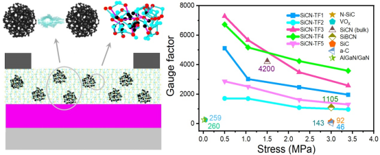 硅碳氮陶瓷具有耐高温、抗氧化、抗腐蚀等优异特性,而其特殊的纳米结构又使其展现出独有的功能特性。廖宁波教授团队提出一种非平衡磁控溅射与快速退火相结合的策略制备了硅碳氮陶瓷薄膜压力传感器。该器件在0.5-3.4 MPa压力下的灵敏因子达1713-7290,远高于目前Si、SiC、VOx、InSe等主流压阻材料的灵敏因子范围(92-1000)。同时,团队通过量子力学计算揭示了硅碳氮陶瓷的纳米结构-压敏特征关系,提出硅碳氮中纳米碳特征距离产生的隧穿效应对其压阻性能影响巨大。本项工作为航天航空、汽车、石油勘探等高温恶劣环境下压力原位测量难题提供了一种有效的解决方案。
