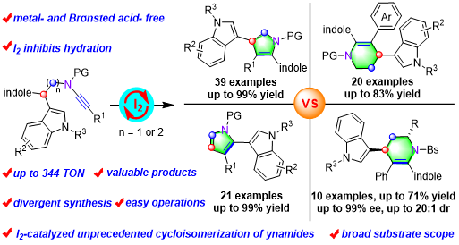 炔酰胺目前已被国内外众多课题组广泛用于构建各种有价值的杂环,特别是氮杂环。其中,以吲哚-炔酰胺作为底物通过5-exo-dig或6-endo-dig环化/迁移反应,可以高效地、原子经济性地构建一系列复杂化合物。然而,所有的报道都局限于1,2-乙烯基迁移或螺环中间体的进一步的环化。与之形成鲜明对比的是,螺环物种中截然不同的C(sp3)-C(sp3)键断裂的反应仍未被研究。更为重要的是,已有的报道有关吲哚-炔酰胺环异构化反应的仅限于过渡金属或Brønsted酸催化剂的使用,无金属和Brønsted酸催化吲哚-炔酰胺环异构化的发展尚未被报道。受Sanz等课题组发展的双吲哚-炔烃重排研究的启发,我们设想将吲哚基团引入色胺-炔酰胺中,实现I2催化的炔烃环异构化,以及未被报道的C(sp3)-C(sp3)键断裂和重排,实现吲哚衍生物的化学选择性和多样性合成。
