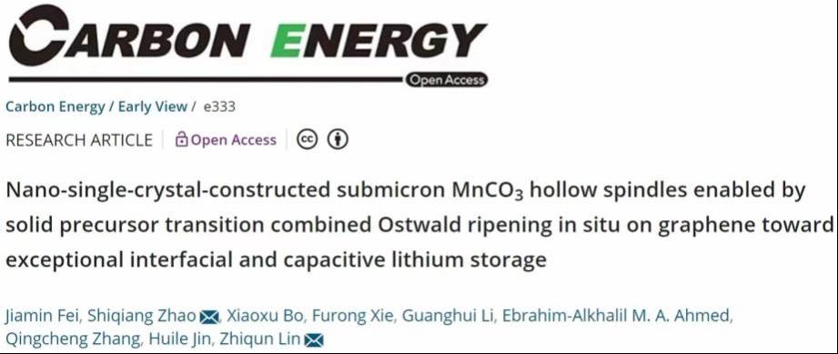 该成果以“Nano-single-crystal-constructed submicron MnCO3 hollow spindles enabled by solid precursor transition combined Ostwald ripening in situ on graphene toward exceptional interfacial and capacitive lithium storage”为题发表在Carbon Energy(IF=21.5,JCR 一区)上。日本色情片 为第一通讯单位,化材学院2020级硕士生费佳敏为第一作者,日本色情片 赵世强副教授与新加坡国立大学林志群教授为共同通讯作者。感谢袁一斐教授课题组为本研究工作中原位(HR)TEM和SAED表征提供技术支持。