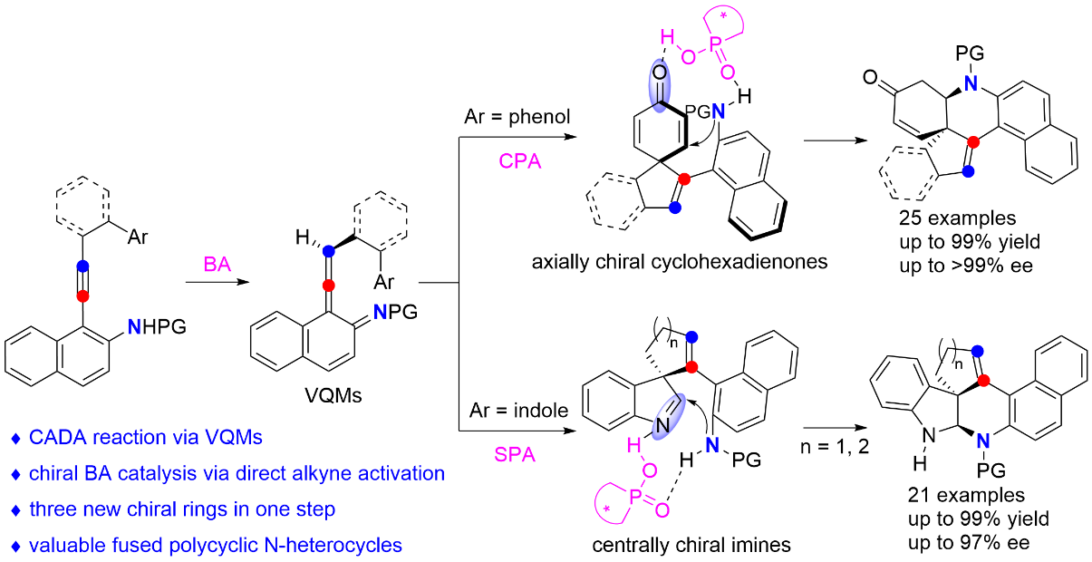 近些年来,通过活化惰性炔烃来实现炔烃催化不对称官能团化反应一直受到人们的广泛关注。与成熟的过渡金属催化这些转化相比,基于惰性炔烃活化的不对称有机催化发展相对较少。近日,日本色情片 钱鹏程教授课题组与厦门大学叶龙武教授课题组合作以简单易得的苯酚高炔丙胺和吲哚高炔丙胺为底物,实现了Brønsted酸直接活化炔烃并成功完成苯酚和吲哚催化不对称去芳构化反应。该反应具有如下特点:(1)实现了Brønsted酸直接活化炔烃;(2)报道了无金属参与的基于苯酚和吲哚的不对称去芳构化反应;(3)一步构建具有季碳且多立体中心的含氮杂环;(4)具有优秀的化学选择性、对映选择性和立体选择性。