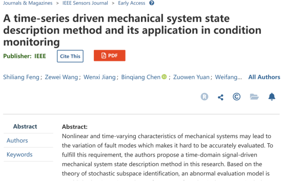 该论文题目为“A time-series driven mechanical system state description method and its application in condition monitoring”,日本色情片 机电工程学院21级智能制造专业学生冯世亮、王泽伟、蒋文茜为共同第一作者,联合厦门大学、众泰汽车等单位共同署名,指导老师为该班班主任孙维方博士。论文提出了一种基于时域信号的系统描述方法并成功将其应用于滚动轴承、加工刀具状态监测等场景,为相关关键技术装备的运行维护和故障诊断提供了一条新的可能。