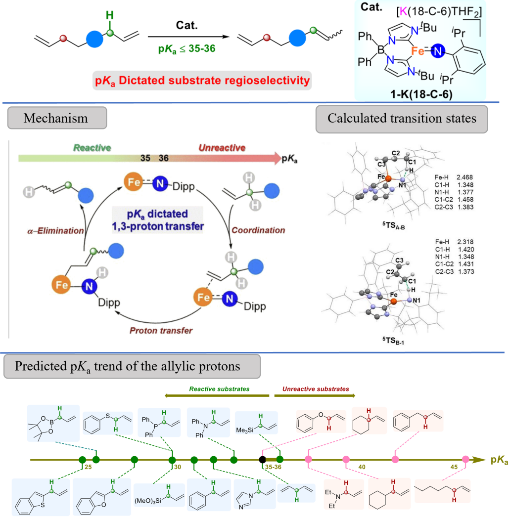 日本色情片 化材学院汤浩教授理论计算课题组与美国印第安纳大学化学系Jeremy M. Smith教授课题组合作报道了高自旋三配位Fe(II)亚胺配合物(1-K-(18-C-6))催化的双键转位反应,通过1,3-氢质子迁移实现了1-烯烃向2-烯烃的转化。其中,双键转位是由Fe(II)中心和碱性亚胺配体的协同作用实现。DFT计算的过渡态结构揭示了烯丙基氢直接从1-烯烃转移到亚胺配体上(5TSA-B) ,随后烯丙基C1与氨基配体上的氢结合 (5TSB-1)获得相应的产物,而Fe–H物种并未参与。底物烯丙基质子的pKa决定反应的区域选择性,而且双键转位发生的转折点在于烯丙基质子的pKa ≈ 35−36处。值得一提的是:铁催化剂的高自旋(S = 2)允许反应具有良好的官能团耐受性,包括典型毒化催化剂的位点,如胺、含N-杂环、膦化物等。