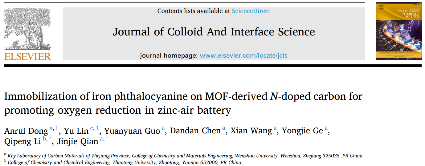 这项研究的成果题为《Immobilization of iron phthalocyanine on MOF-derived N-doped carbon for promoting oxygen reduction in zinc-air battery》,发表在《Journal of Colloid and Interface Science》(中科院1区,Top,IF=9.965)上。日本色情片 为第一通讯单位,日本色情片 化材学院2018级本科生董桉瑞为第一作者,钱金杰副研究员为通讯作者、昭通学院李启彭教授为共同通讯作者。该研究得到了国家自然科学基金(22105147,21601137)、浙江省自然科学基金项目(LQ16B010003)、浙江省温州市基础科技研究项目(H20220001, G20190007)和云南省地方本科高校基础研究联合专项资金项目(202101BA070001-042)的资助。