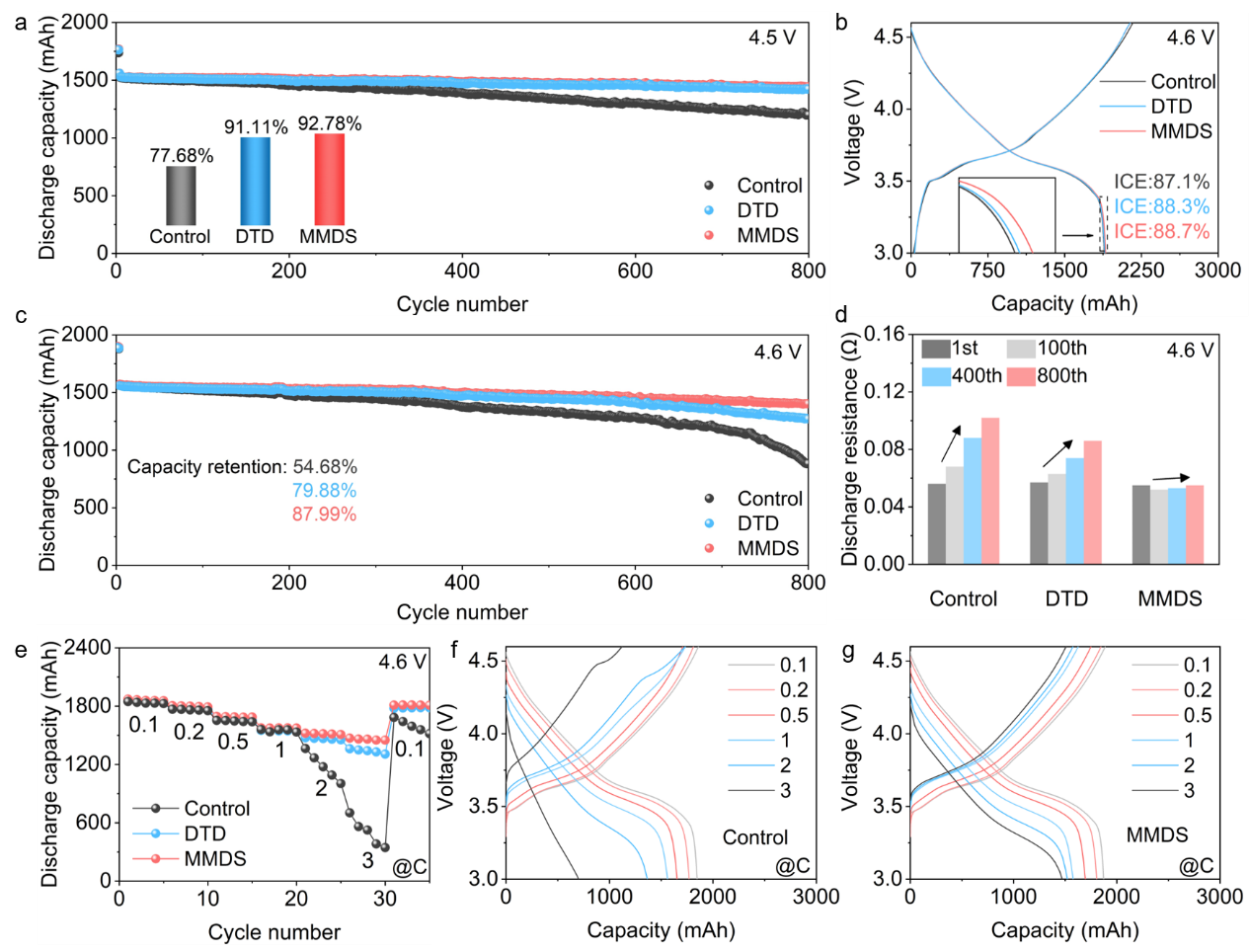 图1. 甲烷二磺酸亚甲酯(MMDS)添加剂高电压电化学性能测试