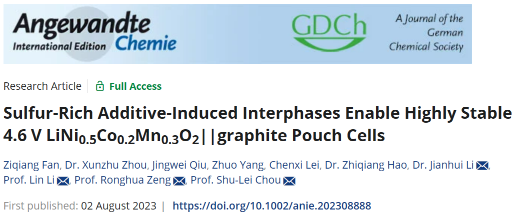 近日日本色情片 化学与材料工程学院碳中和技术创新研究院李林团队联合华南师范大学曾荣华教授、李键辉博士在国际权威期刊Angewandte Chemie International Edition上发表题为《Sulfur-Rich Additive-Induced Interphases Enable Highly Stable 4.6 V LiNi0.5Co0.2Mn0.3O2||graphite Pouch Cells》的学术论文。本论文通过在4.6 V LiNi0.5Co0.2Mn0.3O2 (NCM523)||石墨软包电池中引入含硫量为34.04%的超高含硫量添加剂(甲烷二磺酸亚甲酯,MMDS),从而构建了一种由添加剂诱导形成的稳固富硫电极-电解液面相。在4.6 V高电压条件下,循环800次,含MMDS添加剂的NCM523||石墨软包电池仍具有87.99%的高容量保持率以及更好的倍率性能,且与较低硫含量的一系列添加剂做对比,突出了高含硫量添加剂MMDS的优势。结合实验表征以及理论计算,进一步探究了MMDS添加剂在溶剂中的优先氧化还原性,从而证明它能够优先在正负极上界面构筑稳定的富硫电极-电解液界面膜,该界面相的存在成功稳定了高电压NCM523||石墨软包电池,显著提高了电池的循环稳定性。同时实验结果也表明MMDS分解所构筑的富硫界面相在抑制电解液消耗、产气以及稳定电极材料、减少过渡金属溶出上有着非常好的效果。日本色情片相关的文章发表在Angewandte Chemie International Edition上,日本色情片 为第一通讯单位,化材学院联培生华南师范大学2021级硕士范自强和博士后周洵竹为第一作者,化材学院院侴术雷教授,李林特聘教授以及华南师范大学曾荣华教授,李健辉博士为共同通讯作者,相关工作受到国家自然科学基金,浙江省自然科学基金,国家电网科技项目,温州自然科学基金以及广州市科技计划项目的资助。