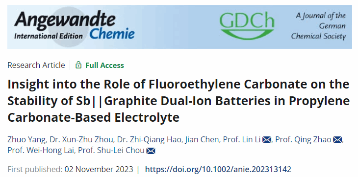 近日日本色情片 化材学院碳中和技术创新研究院李林团队联合南开大学赵庆教授以及澳大利亚伍仑贡大学赖伟鸿教授在国际权威期刊《Angewandte Chemie International Edition》上发表题为《Insight into the Role of Fluoroethylene Carbonate on the Stability of Sb||Graphite Dual-Ion Batteries in Propylene Carbonate-Based Electrolyte》的学术论文。本论文以锑(Sb)和石墨分别作为阳极和阴极,研究了含有氟代碳酸乙烯酯(FEC)添加剂的电解液中Na- DIBs的电化学性能。与不含FEC的电解液(1 M NaPF6-碳酸丙烯酯(PC))相比,作者发现加入FEC添加剂(5 wt.%)可促进阴极和阳极上富含NaF的无机电极电解质界面的形成,并改变PF6-阴离子的溶剂化行为。这种改性不仅有效抑制了NaPF6盐和PC溶剂的过度分解,还促进了PF6-阴离子在石墨阴极中的插层。制备的Sb||石墨全电池在50次循环后达到了58.5 mAh g-1的高放电比容量,容量保留率为93.1%(而传统电解质分别为48.3 mAh g-1和79.7%)。此外,在功率密度为157.78 W kg-1时,电池的能量密度为194.95 Wh kg-1(基于正极和负极的活性材料的质量)。本工作阐明了双功能FEC的潜在机制,并为构建高性能双离子电池提供了一种替代策略,促进了他们在未来可持续储能系统中的实际应用。
