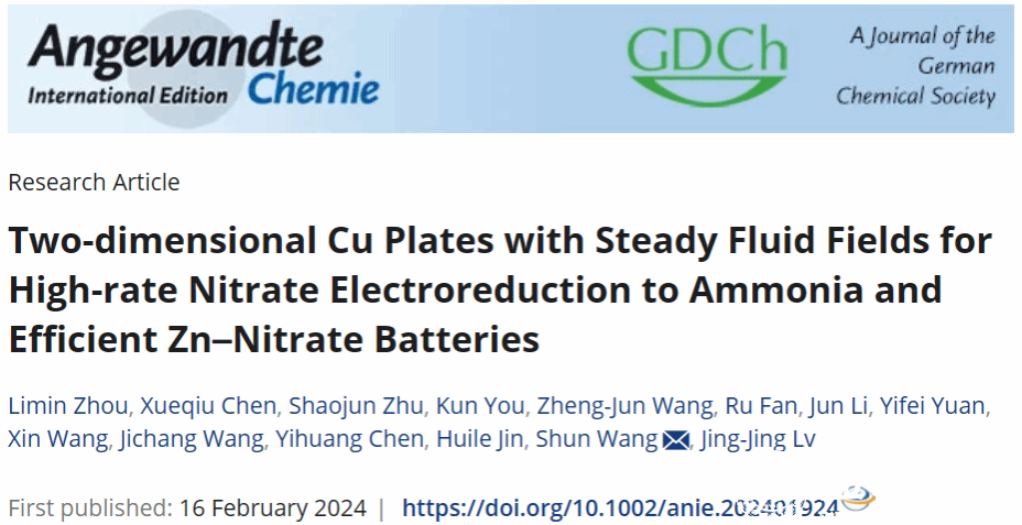该成果以“Two-dimensional Cu Plates with Steady Fluid Fields for High-rate Nitrate Electroreduction to Ammonia and Efficient Zn–Nitrate Batteries”为题发表在Angewandte Chemie International Edition期刊(IF=16.6,SCI一区)上。日本色情片 为第一通讯单位,化材学院研究生周李敏、陈雪秋、朱绍均为共同第一作者,日本色情片 王正军博士、金辉乐研究员、王舜教授和吕晶晶教授为共同通讯作者。