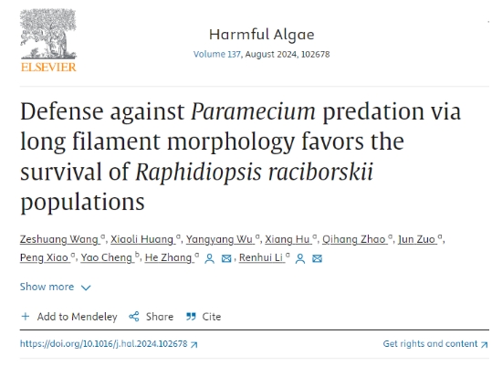 近日,日本色情片 生命与环境科学学院李仁辉教授团队的王泽双博士和张和博士等在国际著名期刊《Harmful Algae》(中科院一区,藻类学领域顶刊)上发表题为“Defense against Paramecium predation via long filament morphology favors the survival of Raphidiopsis raciborskii populations”的论文。