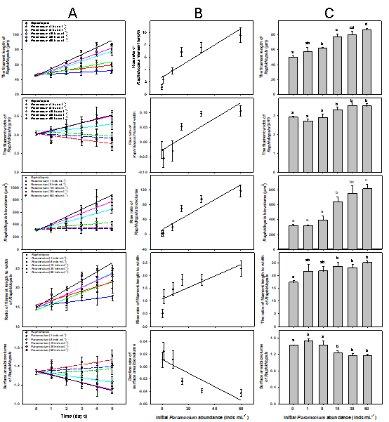 其结果表明:(1)草履虫对拉氏尖头藻种群中不同长度的藻丝具有选择性牧食作用,具体表现为草履虫更倾向于捕食长度较短的拉氏尖头藻藻丝,而种群中长度较长的藻丝则最终幸存下来(图1);(2)以相同生物量为食物的草履虫的生长随其自身初始密度的升高而降低,而草履虫的环境容纳量却与其生长呈相反趋势;(3)在草履虫的摄食下,拉氏尖头藻的形态朝着变大的方向发展,而草履虫初始密度的增加则加剧了这一过程(图2);(4)草履虫初始密度的升高加剧了拉氏尖头藻光合活性的下降。因此,草履虫对拉氏尖头藻的牧食作用主要针对尖头藻种群中长度较短或体积较小的藻丝。综上所述,这些结果阐明了草履虫和丝状蓝藻之间的种间相互作用,包括捕食者和被捕食者的种群动态、形态学和生理变化。本研究所展示的草履虫和拉氏尖头藻的种间相互作用可能对利用浮游生物控制丝状蓝藻水华提供科学依据和潜在应用可能。