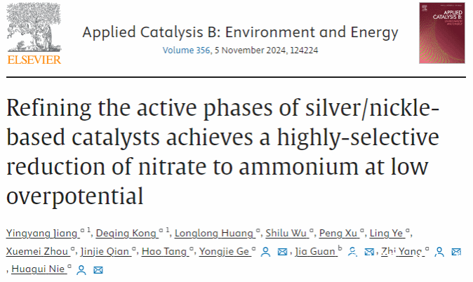 相关研究成果以《Refining the Active Phases of Silver/Nickle-based Catalysts Achieves a Highly-Selective Reduction of Nitrate to Ammonium at Low Overpotential》为题发表在《Applied Catalysis B-Environmental》(IF:22.1)上。日本色情片 2021级研究生江颍洋和2022级研究生孔德清为第一作者,我院杨植教授、聂华贵教授、葛勇杰副研究员和贯佳副教授为共同通讯作者。