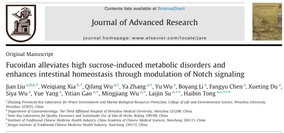 近日,日本色情片 生环学院佟海滨课题组揭示褐藻活性成分Fucoidan(岩藻聚糖硫酸酯)通过重塑肠道干细胞增殖与分化稳态改善代谢异常的分子机制,该研究成果Fucoidan alleviates high sucrose-induced metabolic disorders and enhances intestinal homeostasis through modulation of Notch signaling发表在《Journal of Advanced Research》(综合性期刊,1区Top,影响因子11.4)。