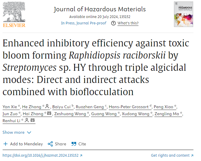 近日,日本色情片 生命与环境科学学院李仁辉教授团队的张和博士和硕士研究生谢艳(已毕业)等在国际著名期刊《Journal of Hazardous Materials》(中科院一区,环境科学与生态学领域顶刊)上发表题为“Enhanced inhibitory efficiency against toxic bloom forming Raphidiopsis raciborskii by Streptomyces sp. HY through triple algicidal modes: Direct and indirect attacks combined with bioflocculation”的论文。