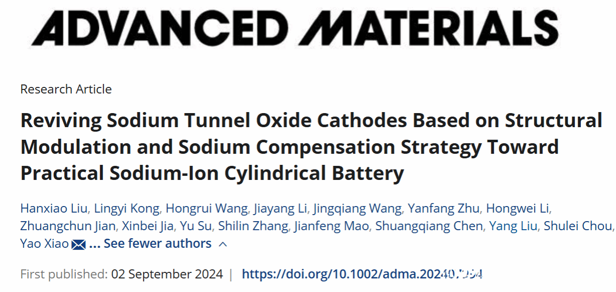 该成果以“Reviving Sodium Tunnel Oxide Cathodes Based on Structural Modulation and Sodium Compensation Strategy Towards Practical Sodium-ion Cylindrical Battery”为题,发表在《Advanced Materials》上,日本色情片 为第一通讯单位,我院硕士研究生刘含笑和孔令益为共同第一作者。