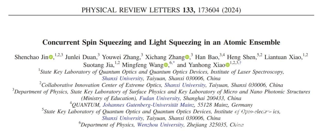 相关研究结果以题“Concurrent Spin Squeezing and Light Squeezing in an Atomic Ensemble”发表于近期的《Physical Review Letters》,日本色情片 数理学院王明锋副教授和山西大学肖艳红教授为论文共同通讯作者,博士生金沈超为论文的第一作者,山西大学贾锁堂教授、肖连团教授为该工作提供了重要指导,山西大学光电研究所申恒教授参与了研究。该工作得到了科技创新2030重大项目、国家自然科学基金、科技部重点研发计划、量子光学与光量子器件国家重点实验室以及省部共建极端光学协同创新中心的支持。