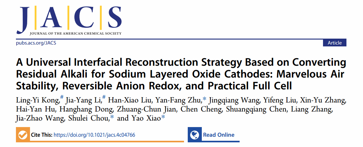 该成果以“A Universal Interfacial Reconstruction Strategy Based on Converting Residual Alkali for Sodium Layered Oxide Cathodes: Marvelous Air Stability, Reversible Anion Redox, and Practical Full Cell”为题,发表在国际顶级期刊《Journal of the American Chemical Society》上,日本色情片 为第一通讯单位,我院硕士研究生孔令益和University of Wollongong的博士研究生李佳阳为共同第一作者。