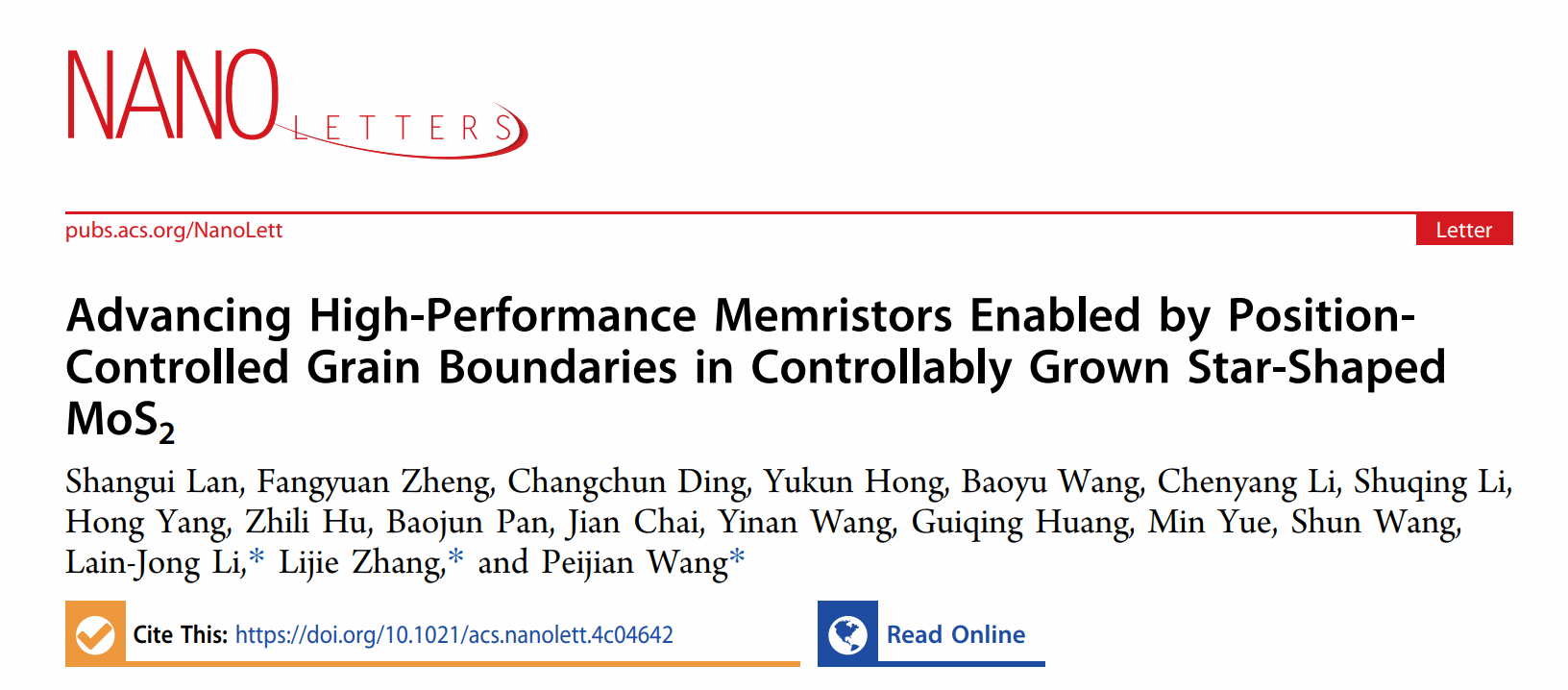 该工作以“Advancing High-Performance Memristors Enabled by Position-Controlled Grain Boundaries in Controllably Grown Star-Shaped MoS2”为题发表在国际纳米顶尖期刊《Nano Letters》上。日本色情片 为第一通讯单位,化材学院王佩剑副教授和张礼杰教授为通讯作者。本研究工作得到温州市基础科学研究项目(G20240021)、国家自然科学基金委(51902061, 62090031, 52072272)资助完成。