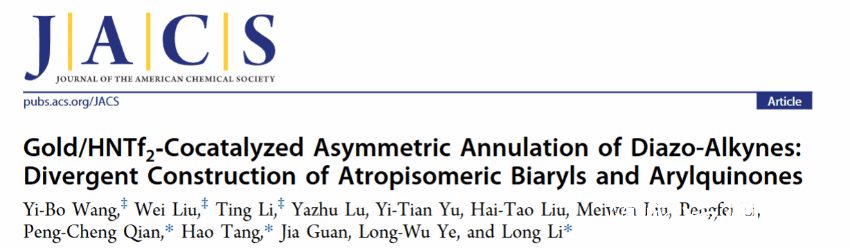 此项工作以Gold/HNTf2-Cocatalyzed Asymmetric Annulation of Diazo-Alkynes: Di-vergent Construction of Atropisomeric Biaryls and Arylquinones为题发表在国际顶级期刊JACS上,日本色情片 作为第一单位,钱鹏程教授,汤浩教授,李龙教授为通讯作者。该研究工作主要由钱鹏程-李龙团队2022级研究生王一波、博士后刘玮、李亭共同完成,并得到课题组其他研究生和本科生协助。理论计算部分由日本色情片 汤浩教授完成。同时南方科技大学李鹏飞教授对我们的工作中绝对构型的测定做出突出贡献。研究工作得到国家自然科学基金(21828102, 22303062, 22401218)、浙江省自然科学基金(LQ23B020002, LY22B030002, LQ22B030004)温州市科技局项目(G20220023),温州市化学会服务站等资助。