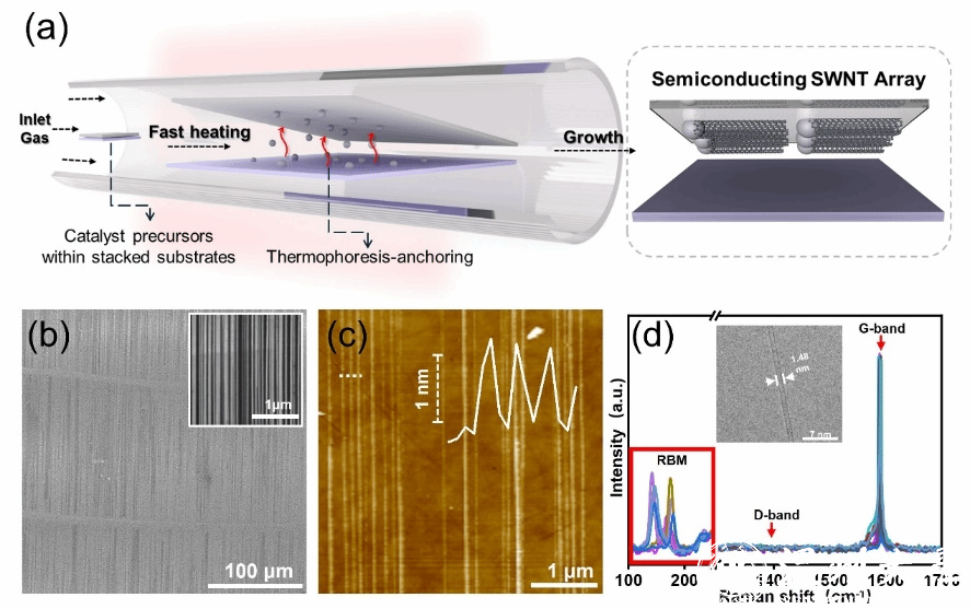 图1. a) 该示意图展示了SiOx纳米颗粒在覆盖的石英基底上的浮动装载过程以及水平SWNT阵列的生长。b) SWNT阵列的低倍扫描电子显微镜图像(插图显示了更高倍数下的相应阵列)。c) SWNT阵列在石英表面上的原子力显微镜图像(插图是标记位置的白线高度轮廓)。d) 在532 nm激光激发下,生长在石英基底上的SWNT的拉曼光谱(插图是单个S)