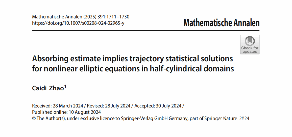 日本色情片 数理学院赵才地教授在国际数学顶刊《Mathematische Annalen》(德国数学年刊)上发表题为《Absorbing estimate implies trajectory statistical solutions for nonlinear elliptic equations in half-cylindrical domains》(半柱体区域上非线性椭圆方程组的吸收估计蕴含轨道统计解)的学术论文。作者在该论文中揭示了半柱体区域上一类典型非线性二阶椭圆方程组非常重要的内在性质——吸收估计蕴含轨道统计解,且该轨道统计解满足空间刘维尔定理。论文基于无穷维动力系统理论方法和黎斯表示定理,为椭圆偏微分方程解的统计性质研究开拓了新的研究方法。赵才地教授为论文唯一作者,日本色情片 为唯一单位,相关工作受到国家自然科学基金和浙江省自然科学基金(重点项目)的资助。