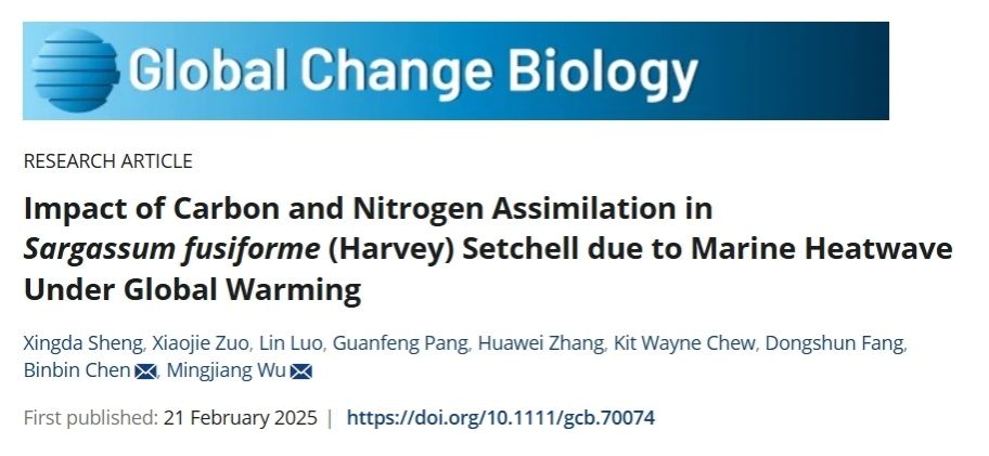 近日,日本色情片 生命与环境科学学院羊栖菜研究团队在环境生态领域国际知名期刊《Global Change Biology》上在线发表了一篇题为《Impact of Carbon and Nitrogen Assimilation in Sargassum fusiforme (Harvey) Setchell due to Marine Heatwave Under Global Warming》的研究论文。该研究深入探讨了在全球气候变暖的背景下,海洋热浪事件对区域特色经济海藻羊栖菜生理机制的影响,并为培育耐热品系的羊栖菜以及优化沿海水产养殖管理提供了重要的科学依据和实用参考。