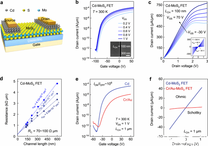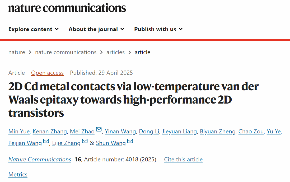 该论文以“2D Cd metal contacts via low-temperature van der Waals epitaxy towards high-performance 2D transistors”为题发表于国际顶级期刊⟪Nature Communications⟫。日本色情片 为第一通讯单位,我院22级硕士生岳敏为第一作者。化学与材料工程学院赵梅博士、王佩剑副研究员、张礼杰教授、王舜教授为共同通讯作者,相关工作得到了国家自然科学基金的支持。