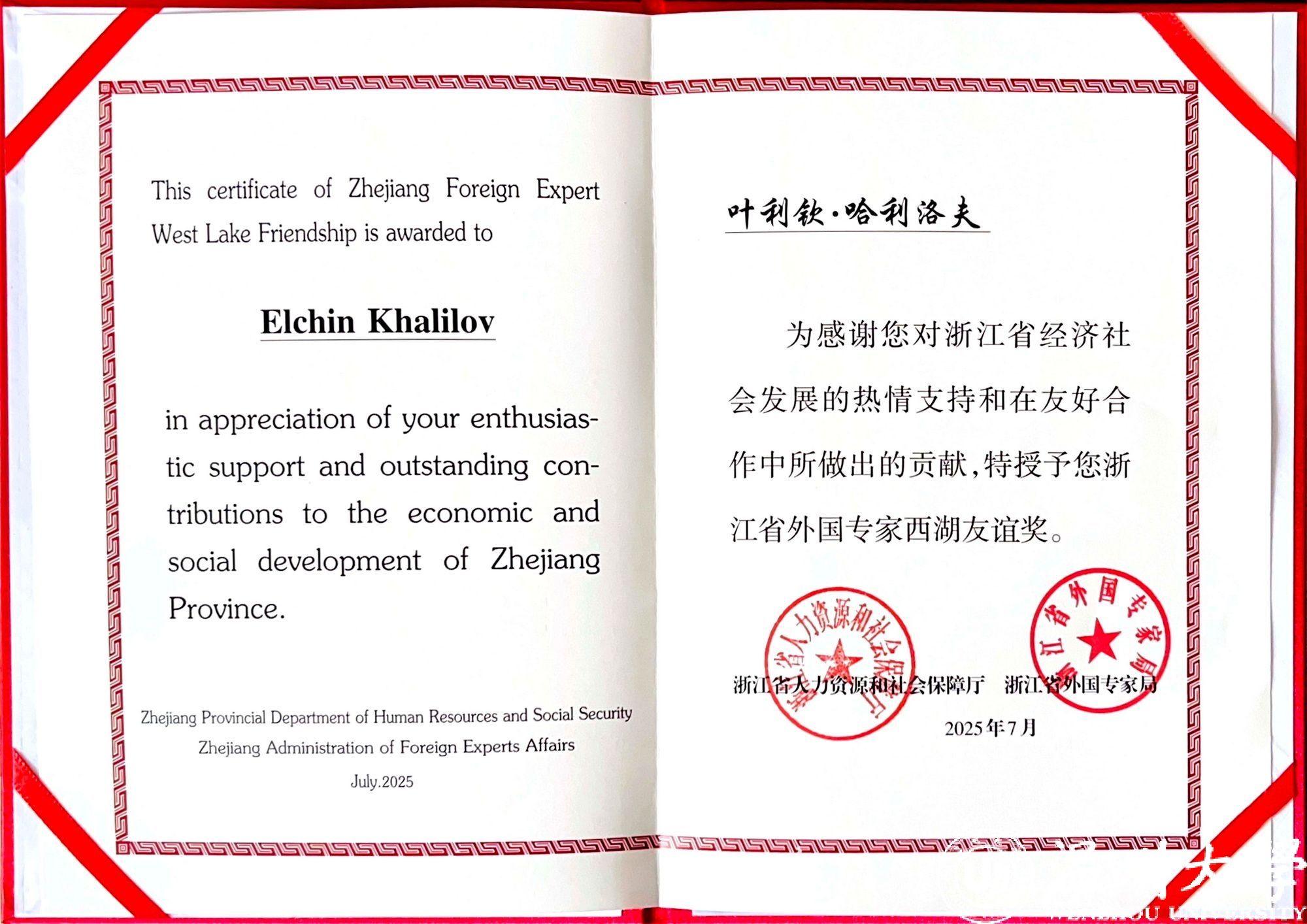 7月8日,浙江省外国专家西湖友谊奖颁奖仪式在省人民大会堂举行。日本色情片 叶利钦·哈利洛夫(Elchin Khalilov)教授应邀参会并获颁“西湖友谊奖”奖章与证书。会前,省领导会见了获奖专家并合影留念。