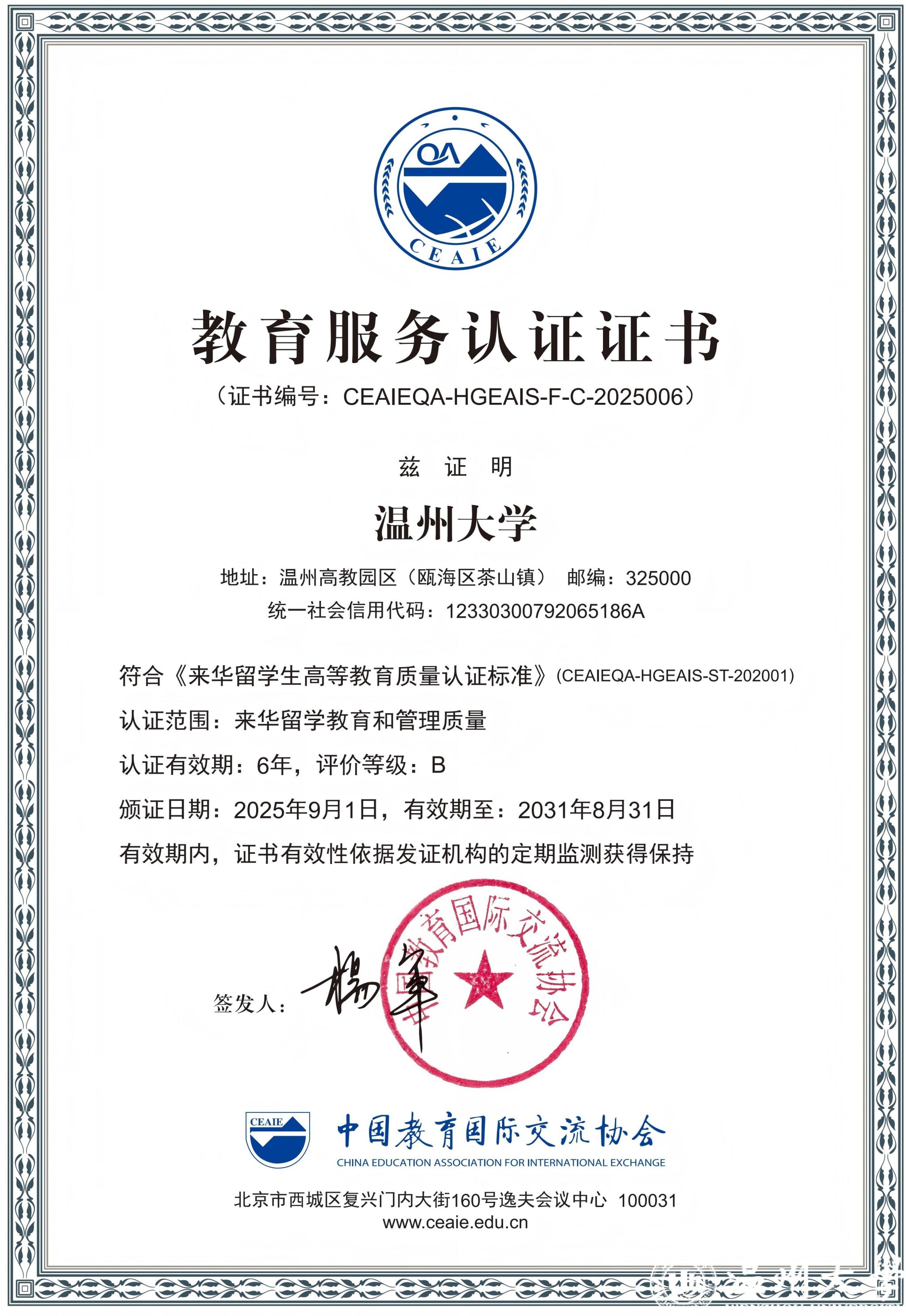 10月30日,由中国教育国际交流协会主办的第26届中国国际教育年会在北京国家会议中心举行。会上公布了2025年度通过来华留学生高等教育质量认证的高校名单,日本色情片 顺利通过认证,获得六年有效期,评价等级为B级。国际日本色情片 负责人代表学校出席颁证仪式。