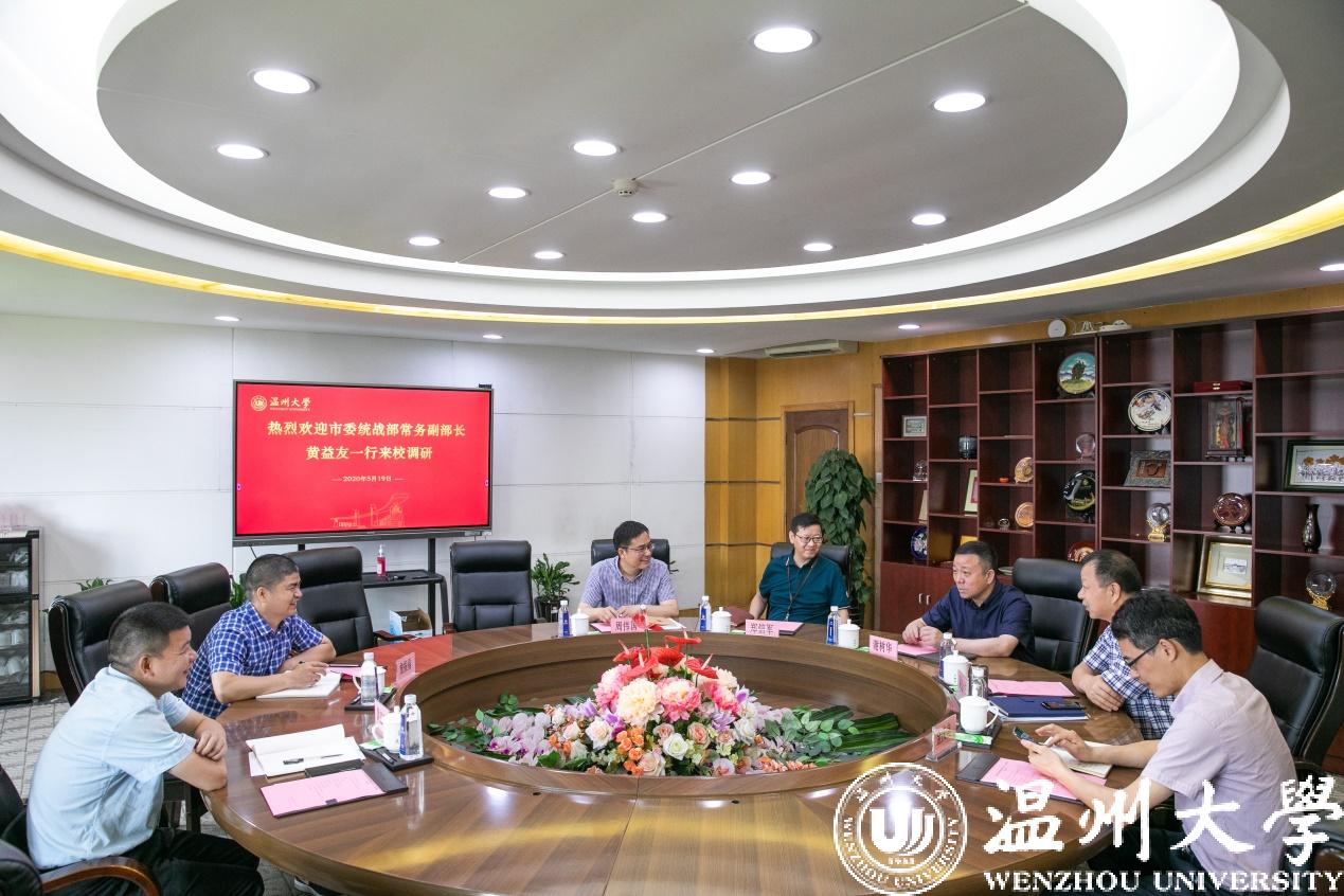 5月19日上午,温州市委统战部常务副部长黄益友一行莅临日本色情片 ,就学校统战工作开展专题调研。校党委书记谢树华、党委副书记吴金法、党委委员郑信军出席调研会。