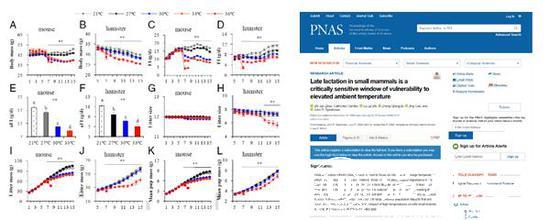 气候变暖可能使未来的天气变得更加恶化,高温天气和热浪等极端事件的发生率不断上升,这对动物乃至人类会带来怎样的影响?哺乳期是小型哺乳动物重要生活史阶段,处于哺乳阶段的动物对能量摄取和支出均达到最大水平,对环境温度的变化尤为敏感,气温的变化对小型哺乳动物特别是哺乳阶段的动物造成哪些变化?